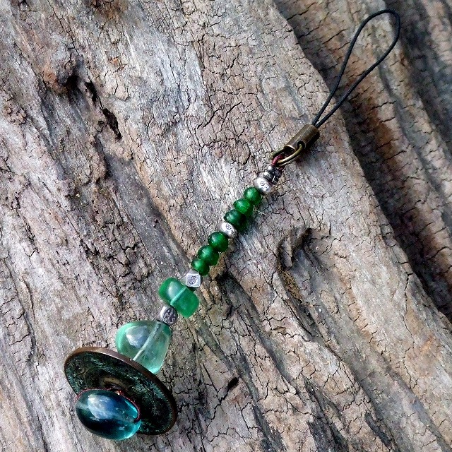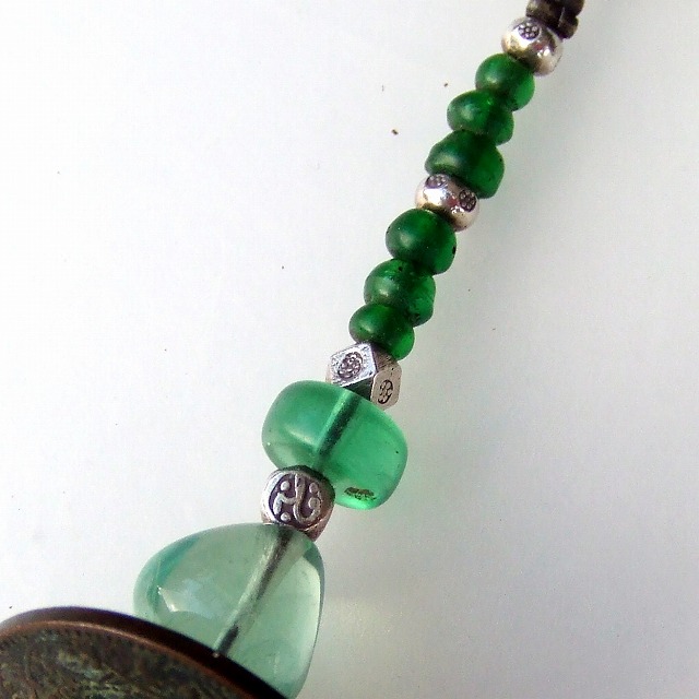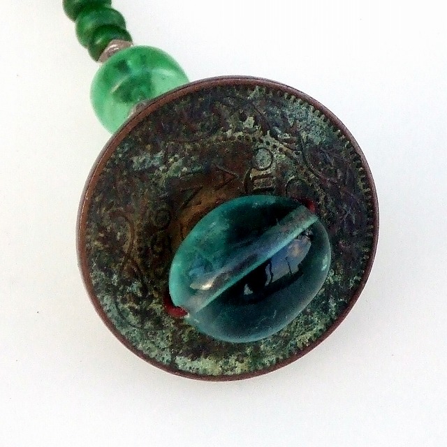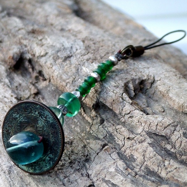 フローライト・古銭・オールドビーズの緑ストラップ -