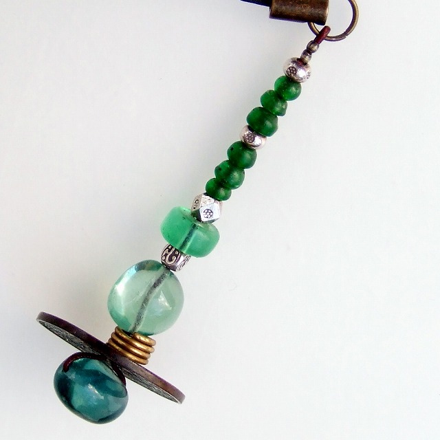 ★濃い緑の小さなビーズと筒型のビーズはインドのナーガランド産のオールドビーズです。ナーガランドは古い民族文化が残っていてカラフルなオールドガラスビーズがたくさんあります♪